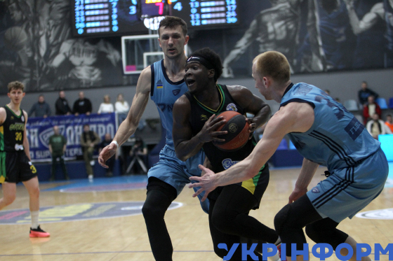 Гравець івано-франківського БК "Прикарпаття-Говерла-КФВ" Лейтерренс Рід (у центрі) під час другого матчу 1/4 фіналу чемпіонату України з баскетболу серед команд Суперліги проти БК "Дніпро", що завершився перемогою господарів майданчика з рахунком 95:80, Дніпро, 5 квітня 2025 року.