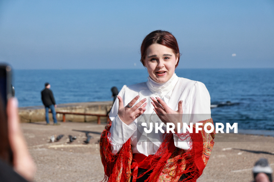 Дівчина декламує один із творів поетеси, драматургині, перекладачки Лесі Українки на території фотозони "Леся в Одесі", що відкрилася з нагоди відзначення 155-річчя від дня народження мисткині, на пляжі "Ланжерон", Одеса, 28 лютого 2026 року.