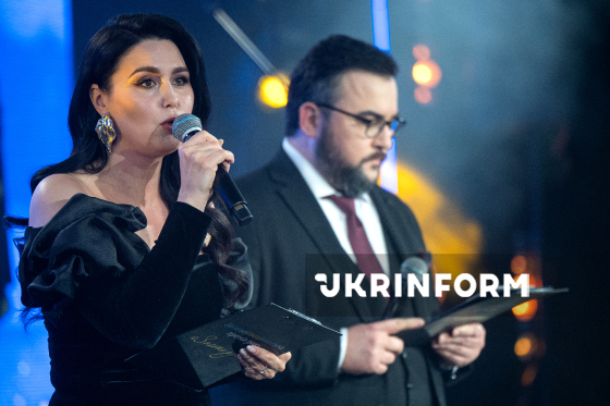 Ведучі заходу Людмила Барбір та Руслан Сенічкін беруть участь у церемонії нагородження VІ Загальнонаціональної премії року "Золоті руки", Київ, 6 грудня 2025 року.
