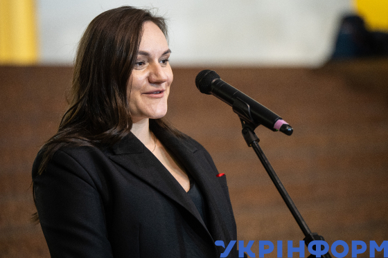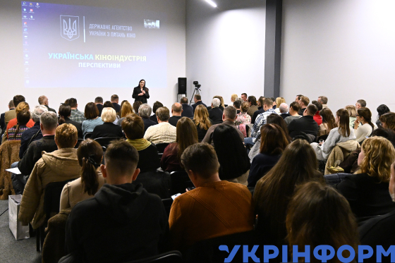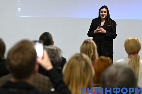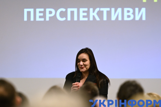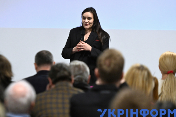 Віцепрем’єр-міністр з гуманітарної політики - міністр культури України Тетяна Бережна (ліворуч) виступає з промовою під час зустрічі з митцями у галузі кіно в Національному центрі Олександра Довженка, Київ, 30 жовтня 2025 року.