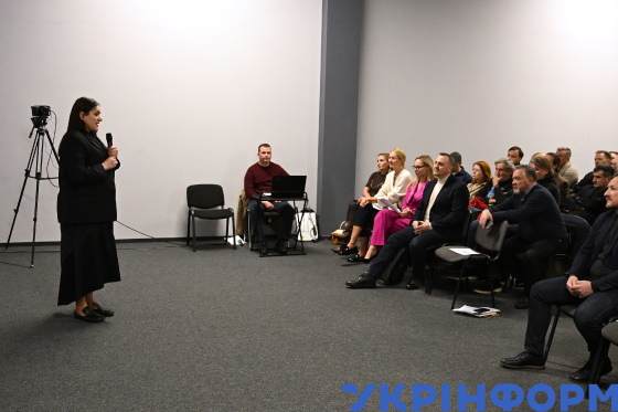 Віцепрем’єр-міністр з гуманітарної політики - міністр культури України Тетяна Бережна (на другому плані) виступає з промовою під час зустрічі з митцями у галузі кіно в Національному центрі Олександра Довженка, Київ, 30 жовтня 2025 року.