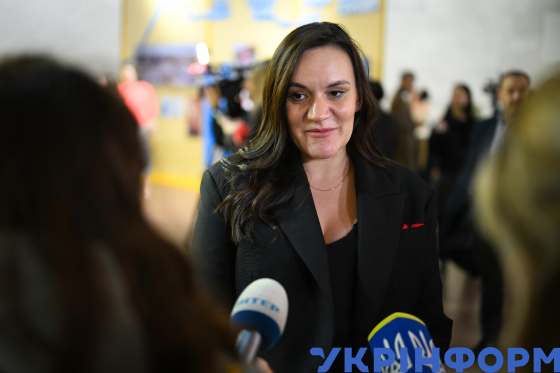 Віцепрем`єр-міністр - міністр культури України Тетяна Бережна дає коментар журналістам на відкритті виставки “Павільйон Not For Sale на EXPO 2025 в Японії. Тепер в Україні” в Українському домі, Київ, 31 жовтня 2025 року. Український павільйон "Not For Sale" ("Не для продажу"), який впродовж шести місяців експонувався на Всесвітній виставці EXPO 2025 в Японії та зібрав понад 3,2 мільйона відвідувачів, повернувся в Україну. В експозиції представлено 18 об`єктів, кожен із яких уособлює одну з людських цінностей. На вході відвідувачі отримують сканер для зчитування штрихкодів, за якими відкриваються історії з України та особисті історії реальних людей.