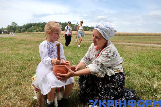 Жінка поруч із дівчинкою під час святкового дійства, присвяченого Медовому Спасу (Маковія) та українським традиціям літа, на території Національного музею народної архітектури та побуту України, Київ, 26 липня 2025 року.