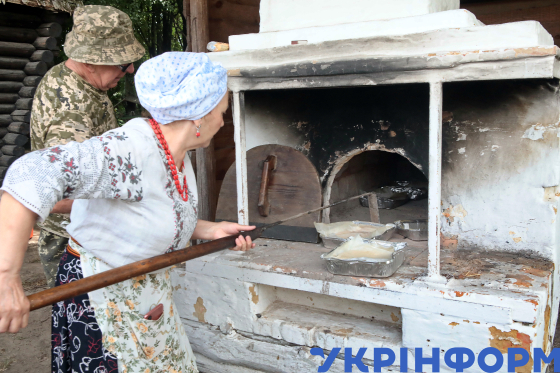 Учасники святкового дійства, присвяченого Медовому Спасу (Маковія) та українським традиціям літа, під час приготування шуликів, традиційної української страви, на території Національного музею народної архітектури та побуту України, Київ, 26 липня 2025 року.