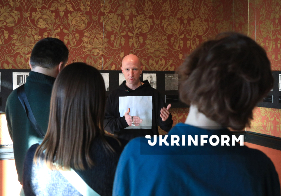 Художник Олександр Ляпін роздивляється експонати виставки художника, графіка та стрітарт-митця Гамлета Зіньківського "Проєкт 365. Час не потрібен", циклу малюнків, створених протягом 2025 року, у Національному музеї мистецтв імені Богдана та Варвари Ханенків, Київ, 20 березня 2026 року.