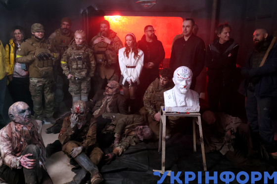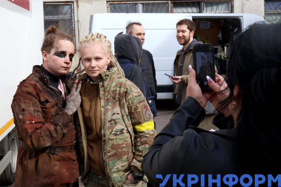 Акторка Марина Кошкіна (у центрі) позує для фото під час зйомок фільму "Каховський об’єкт", Київ, 10 березня 2025 року.