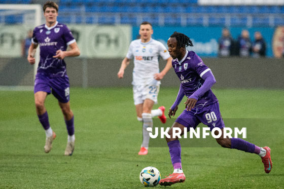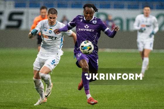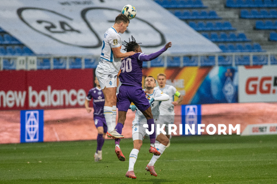Гравці ФК "ЛНЗ" (Черкаси) Марк Ассінор (праворуч) і ФК "Динамо" (Київ) Владислав Кабаєв біжать за м’ячем під час матчу 12-го туру чемпіонату України з футболу серед команд Премʼєр-ліги (УПЛ), що завершився з рахунком 0:1 на користь гостей, на стадіоні "Динамо ім. Валерія Лобановського", Київ, 9 листопада 2025 року.