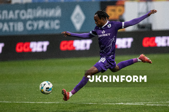 Нападник ФК "ЛНЗ" (Черкаси) Марк Ассінор б`є по м`ячу під час матчу 12-го туру чемпіонату України з футболу серед команд Прем`єр-ліги (УПЛ), що завершився перемогою черкаської команди з рахунком 1:0, на стадіоні "Динамо ім. Валерія Лобановського", Київ, 9 листопада 2025 року.
