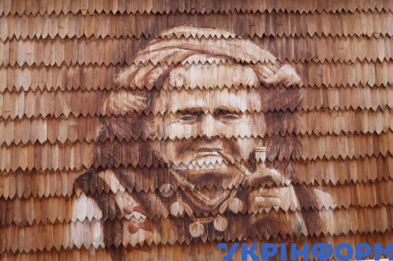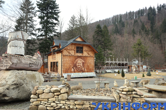Дерев’яний будинок із зображенням мешканки села Верхній Сенів Марії Кречунєк, відомої також як Гуцулка з люлькою або ж Чукутиха, яку у 1926 році сфотографував військовий фотограф Микола Сеньковський, Яремче, Івано-Франківська область, 11 лютого 2024 року.