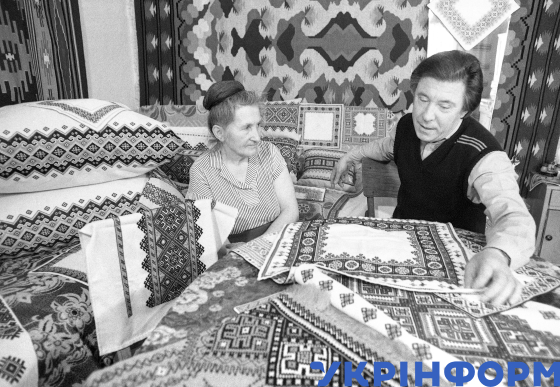 Заслужений майстер народної творчості України Михайло Покиданець знайомиться із творчістю народної майстрині М. Мельник, Калуш, Івано-Франківська область, березень 1990 року. Фото Володимира Миговича.
