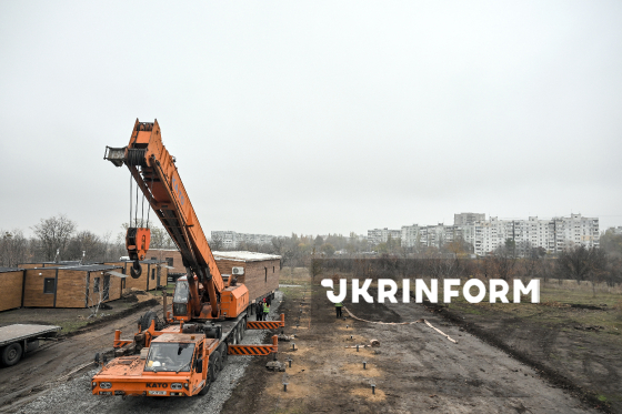 Спецтехніка та робітники працюють під час монтажу будинків на території модульного містечка для вимушених переселенців, Запоріжжя, 6 листопада 2025 року.