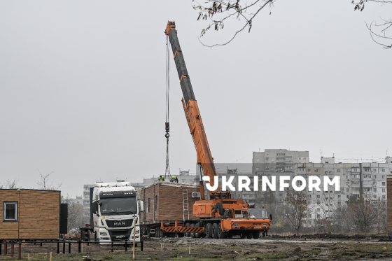 Робітники працюють під час монтажу будинків на території модульного містечка для вимушених переселенців, Запоріжжя, 6 листопада 2025 року.