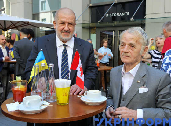Голова Меджлісу кримськотатарського народу Рефат Чубаров (ліворуч) з лідером кримськотатарського народу народним депутатом України Мустафою Джемілєвим під час заходу з нагоди відзначення Дня Канади, Київ, 27 червня 2024 року.