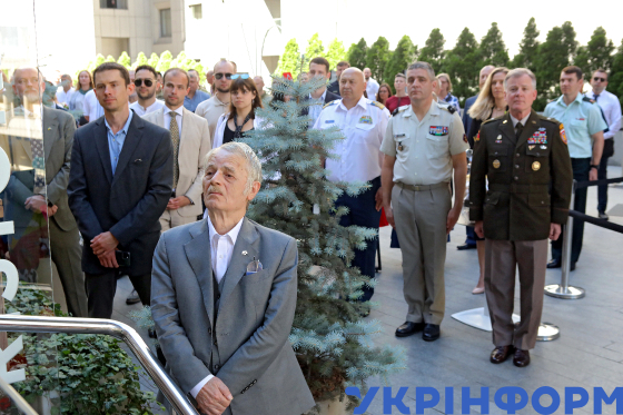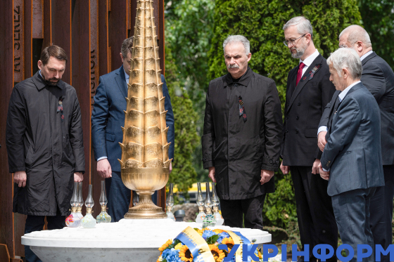 Перший заступник Голови Верховної Ради України Олександр Корнієнко, лідер кримськоготатарського народу Мустафа Джемілєв, голова Меджлісу кримськотатарського народу Рефат Чубаров, Надзвичайний і Повноважний Посол України в Туреччині Наріман Джелял, народний депутат України, голова Державної служби етнополітики і свободи совісті Віктор Єленський, заступник міністра закодонних справ України Євген Перебийніс, міністр культури та стратегічних комунікацій України Микола Точицький (справа наліво) під час церемонії вшанування пам`яті жертв геноциду кримських татар, депортованих радянською владою з Криму в 1944 році, біля Меморіалу пам`яті жертв геноциду кримськотатарського народу у сквері Миру, Київ, 18 травня 2025 року.