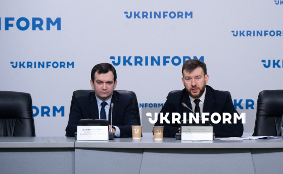 Міністр соціальної політики, сім’ї та єдності України Денис Улютін (праворуч) і голова правління Пенсійного фонду України Євген Капінус беруть участь у брифінгу на тему: "Ідентифікація пенсіонерів: кому призупинили виплати та як їх швидко поновити", Київ, 11 лютого 2026 року.