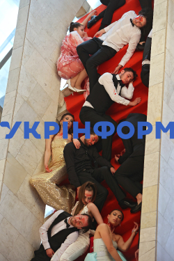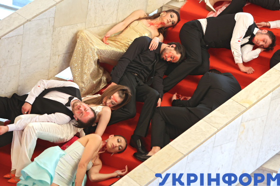 Одну зі сцен вистави "Дзяди" за поемою Адама Міцкевича актори Івано-Франківського національного академічного драматичного театру ім. Івана Франка спільно з командою Краківського театру імені Юліуша Словацького зіграли у фоє Франківського драмтеатру, де було розміщено імпровізований театральний майданчик, Івано-Франківськ, 27 травня 2023 року.
