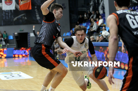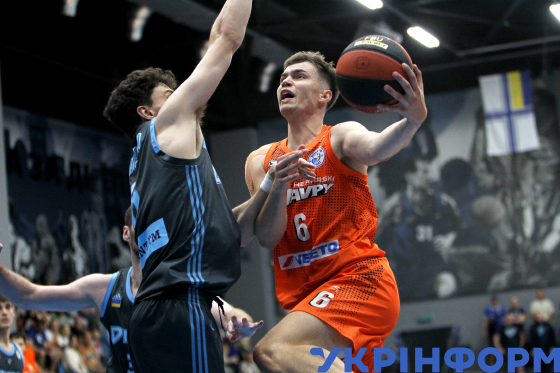 Гравець БК “Черкаські Мавпи” Назар Холод (праворуч) під час матчу чемпіонату України з баскетболу серед команд Суперліги між БК “Дніпро” і БК “Черкаські Мавпи”, що завершився з рахунком 82:53 на користь дніпрян, Дніпро, 6 жовтня 2024 року.