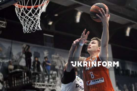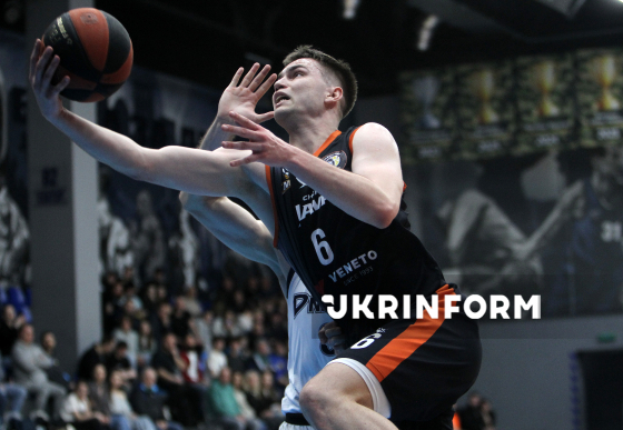 Гравець БК “Черкаські Мавпи” Назар Холод стрибає з м`ячем під час першого матчу 1/4 фіналу чемпіонату України з баскетболу серед команд Суперліги між БК “Дніпро” і БК “Черкаські Мавпи”, що завершився з рахунком 93:62 на користь дніпровської команди, у СК “Шинник”, Дніпро, 4 квітня 2026 року.