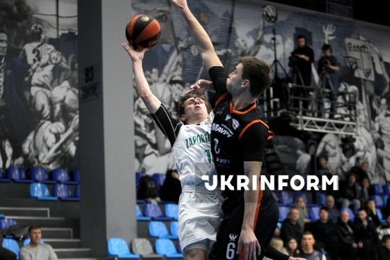 Гравці БК "Запоріжжя" Олександр Петренко (ліворуч) і БК "Черкаські Мавпи" Назар Холод грають під час матчу 11-го туру регулярного чемпіонату Суперліги GGBET, який було перервано через повітряну тривогу за рахунку 67:58 на користь черкаської команди, Дніпро, 1 лютого 2026 року.