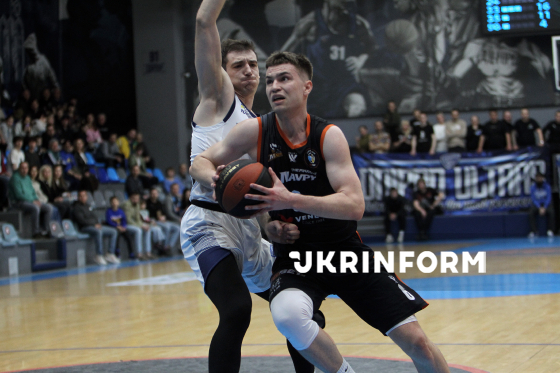 Гравець БК “Дніпро” Євгеній Сорочан і гравець БК “Черкаські Мавпи” Назар Холод борються за м`яч під час першого матчу 1/4 фіналу чемпіонату України з баскетболу серед команд Суперліги між БК “Дніпро” і БК “Черкаські Мавпи”, що завершився з рахунком 93:62 на користь дніпровської команди, у СК “Шинник”, Дніпро, 4 квітня 2026 року.