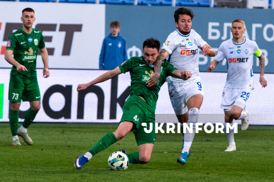 Захисник ФК “Карпати” Віталій Холод, півзахисник ФК “Динамо” Назар Волошин борються за м`яч під час матчу 22-туру чемпіонату України з футболу серед команд Прем`єр-ліги між ФК “Динамо” (Київ) і ФК “Карпати” (Львів), що завершився з рахунком 0:1 на користь львів`ян, на стадіоні “Динамо” імені Валерія Лобановського, Київ, 4 квітня 2026 року.