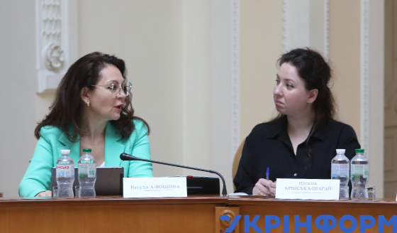 Голова Національного агентства України з питань державної служби Наталія Алюшина (ліворуч) та директорка генерального департаменту з питань політики оплати праці та функціонального розвитку державної служби НАДС Наталія Крінська-Шарай під час засідання Міжвідомчої робочої групи з питань державного управління, Київ, 14 серпня 2024 року.