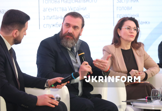 Міністр освіти і науки України Оксен Лісовий, голова Національного агентства України з питань державної служби Наталія Алюшина та заступник голови правління Ощадбанку Тютюн Антон (зліва направо) беруть участь у панельній дискусії на тему: "Досвід і практика. Мова має значення" в межах заходу "Мова гідності: створюємо Державний стандарт безбар’єрної мови", спрямованого на обговорення та впровадження єдиних принципів коректної та недискримінаційної термінології в офіційній та публічній комунікації, Київ, 2 березня 2026 року.
