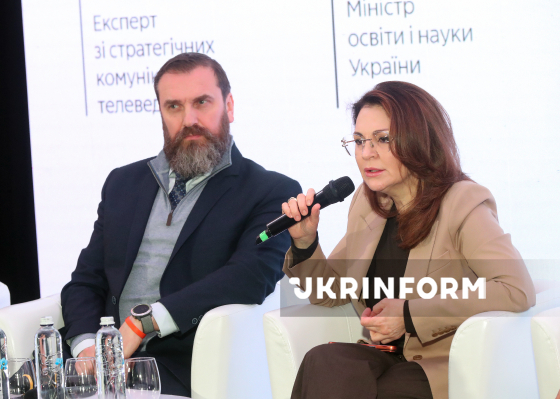 Міністр освіти і науки України Оксен Лісовий та голова Національного агентства України з питань державної служби Наталія Алюшина беруть участь у панельній дискусії на тему: "Досвід і практика. Мова має значення" в межах заходу "Мова гідності: створюємо Державний стандарт безбар’єрної мови", спрямованого на обговорення та впровадження єдиних принципів коректної та недискримінаційної термінології в офіційній та публічній комунікації, Київ, 2 березня 2026 року.