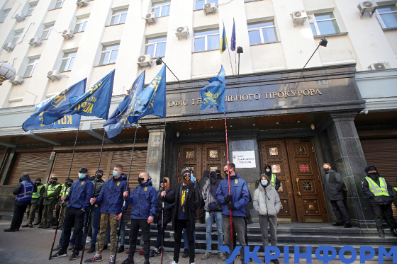 Представники Національного корпусу під час акції-перформансу "Чому не сидить Медведчук?" біля Офісу генерального прокурора, Київ, 25 березня 2021 року.