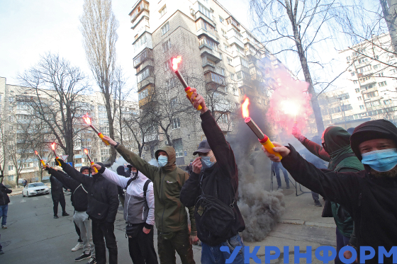Представники Національного корпусу запалили фаєри під час акції-перформансу "Чому не сидить Медведчук?" біля Офісу генерального прокурора, Київ, 25 березня 2021 року.