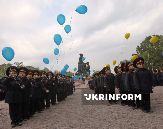 Вихованці ліцею-інтернату № 23 "Кадетський корпус" випускають у небо повітряні кульки в кольорах національної символіки біля монумента жертвам Бабиного Яру на території Національного історико-меморіального заповідника "Бабин Яр" із нагоди 75-х роковин Голокосту, Київ, 29 вересня 2016 року. Фото Володимира Тарасова.