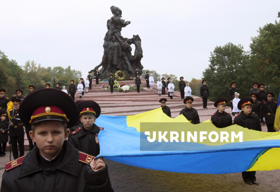 Вихованці ліцею-інтернату № 23 "Кадетський корпус" тримають український прапор під час церемонії покладання квітів до монумента жертвам Бабиного Яру на території Національного історико-меморіального заповідника "Бабин Яр" із нагоди 75-х роковин Голокосту, Київ, 29 вересня 2016 року. Фото Володимира Тарасова.