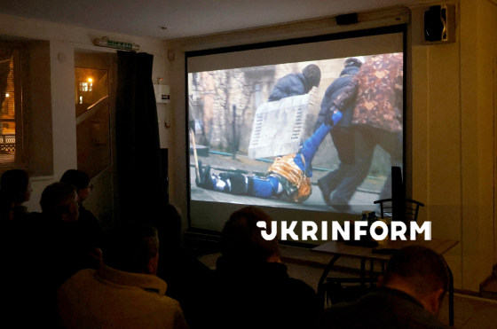 Учасники акції-спомину про Героїв Небесної Сотні дивляться фільм координатора харківського Євромайдану Володимира Чистиліна “Герої не вмирають” про харківців Євгена Котляра, Юрія Паращука та Владислава Зубенка, які загинули під час розстрілів на Майдані Незалежності у Києві у 2014 році, у Харківському місіонерському центрі ГО “Православні східняки”, Харків, 20 лютого 2026 року.