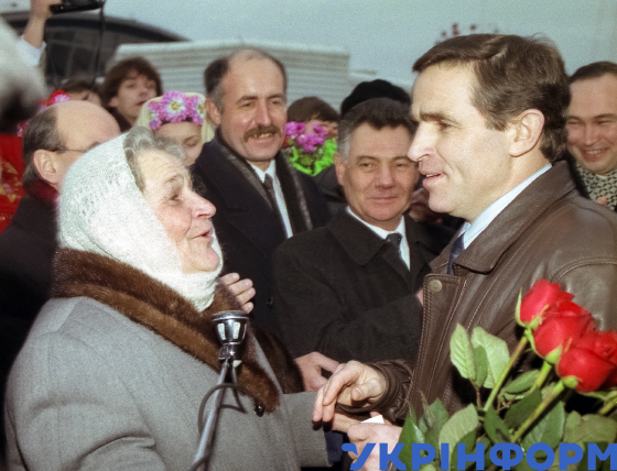 Першого космонавта незалежної України, члена екіпажу міжнародного космічного корабля "Колумбія" Леоніда Каденюка після повернення з космосу зустрічає мати Ніна Каденюк в аеропорту "Бориспіль", Київ, 12 січня 1998 року. Фото Володимира Самохоцького.