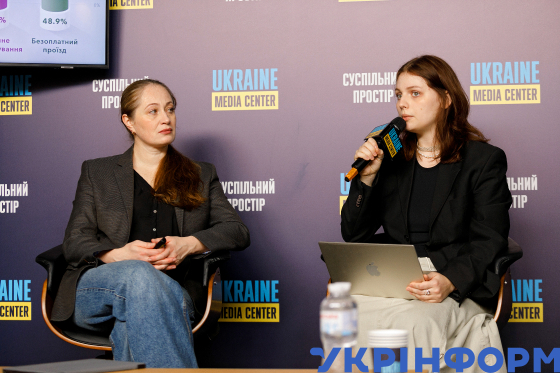 В.о. виконавчого директора Українського ветеранського фонду Ніна Роговець (ліворуч) і начальниця відділу навчально-аналітичної роботи Українського ветеранського фонду Анастасія Селянінова під час презентації результатів дослідження "Актуальні потреби і проблеми ветеранів та ветеранок російсько-української війни" у Медіацентрі Україна, Київ, 19 листопада 2024 року.