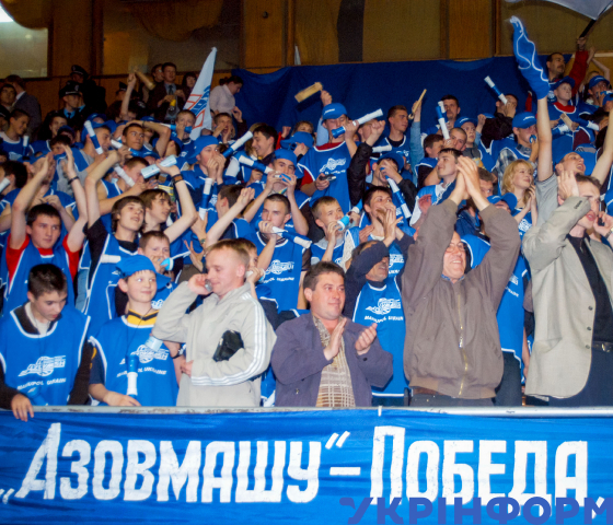 Вболівальники БК "Азовмаш" (Маріуполь), який переміг БК "Київ" з рахунком 90:74 у фінальній серії баскетбольної Суперліги України, Київ, 26 травня 2004 року. Фото Олега Маркевича.