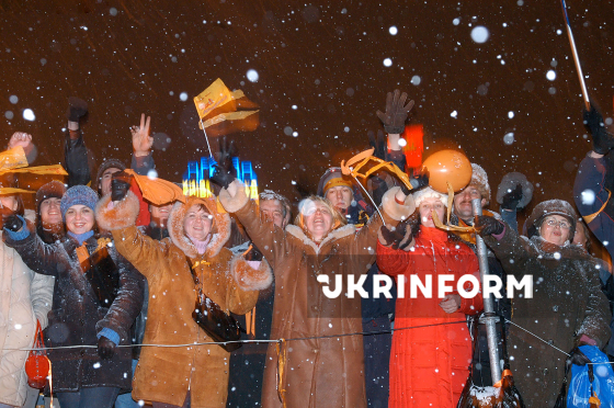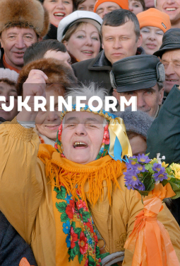 Учасники Помаранчевої революції з українськими та помаранчевими прапорами вітають новообраного Президента України Віктора Ющенка, який прибув на Майдан Незалежності після офіційної інавгурації у Верховній Раді України, Київ, 23 січня 2005 року. Фото Олега Маркевича.