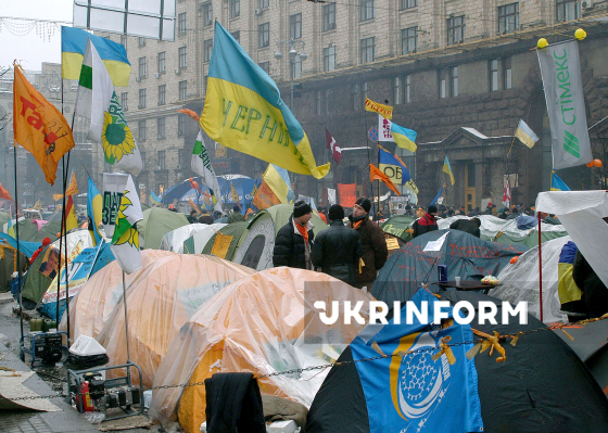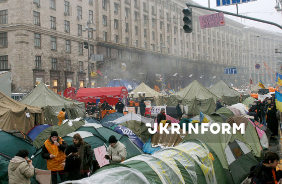 Учасники всеукраїнської акції громадянської непокори за чесні вибори 11-й день протестують у наметовому містечку на Хрещатику, де діють регіональні координаційні штаби, медпункти, чіткі правила дисципліни, чергування, охорона, Київ, 2 грудня 2004 року. Фото Олега Маркевича.