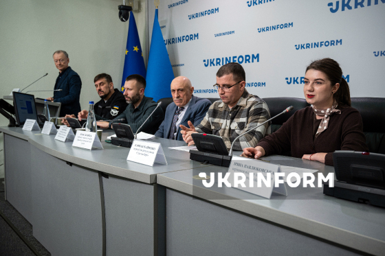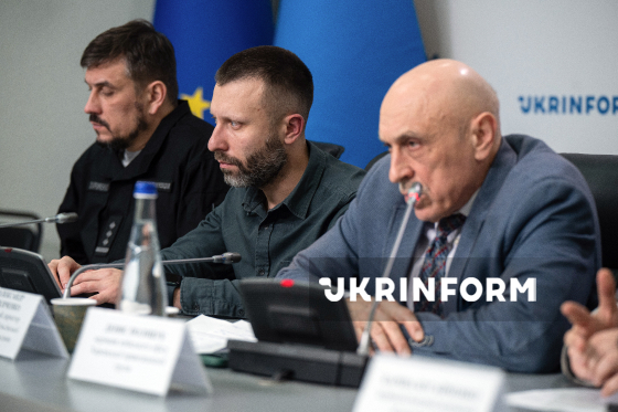 Керівник секретаріату Координаційного штабу з питань поводження з військовополоненими Богдан Охріменко, начальник відділу управління процесуального керівництва та підтримання публічного обвинувачення департаменту протидії злочинам, вчиненим в умовах збройного конфлікту Офісу Генерального прокурора Дмитро Осипов, виконавчий директор Української Гельсінської спілки з прав людини Олександр Павліченко (зліва направо) беруть участь у публічній дискусії на тему: "Як зробити ідентифікацію воєнних злочинців неминучою?", Київ, 18 грудня 2025 року.