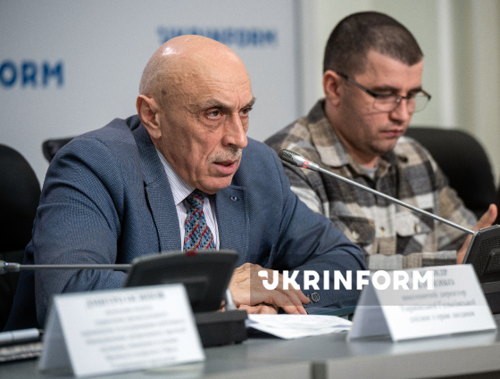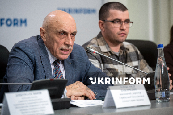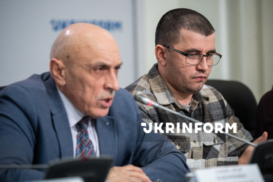 Виконавчий директор Української Гельсінської спілки з прав людини Олександр Павліченко, керівник київського офісу Харківської правозахисної групи Денис Поліщук (зліва направо) беруть участь у публічній дискусії на тему: "Як зробити ідентифікацію воєнних злочинців неминучою?", Київ, 18 грудня 2025 року.
