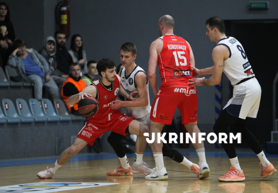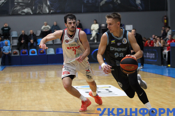 Гравець БК “Рівне” Олександр Поносов і гравець БК “Дніпро” Михайло Горобченко (зліва направо) борються за м`яч під час матчу чемпіонату України з баскетболу серед команд Суперліги між командами “Дніпро” і “Рівне”, що завершився з рахунком 86:68 на користь команди з Дніпра, Дніпро, 28 березня 2026 року.