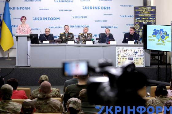 Голова ВГО "Країна", автор 16 державних нагород Олександр Сопов, доброволець, ветеран, старший лейтенант капеланської служби ЗСУ Олексій Сокіл, Герой України, генерал-майор Ігор Гордійчук, в. о. директора Національного музею історії України Богдан Патриляк та журналіст Максим Царенко (зліва направо) під час заходу "Міжнародний "Єдність і подяка" в Українському національному інформаційному агентстві "Укрінформ", Київ, 14 березня 2025 року.