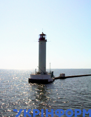 Воронцовський маяк, збудований у 1888 році, на краю Рейдового молу в акваторії Одеського морського порту на Чорному морі, Одеса, 31 липня 2003 року. Фото Олександра Сєрого.