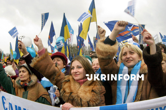 Учасники багатолюдного мітингу після другого туру президентських виборів підтримують провладного кандидата в Президенти України Віктора Януковича на площі Куликове поле, Одеса, 23 листопада 2004 року. Фото Олександра Сєрого.