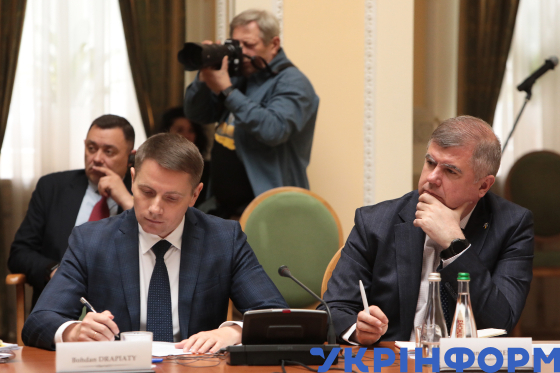 Заступник міністра внутрішніх справ України Богдан Драп`ятий, державний секретар Кабінету Міністрів України Олександр Ярема (зліва направо) під час презентації економічного огляду України та огляду з питань доброчесності та протидії корупції Організації економічного співробітництва та розвитку у клубі Кабінету Міністрів України, Київ, 6 травня 2025 року.