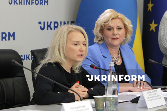 Президентка Міжнародної асоціації позашкільної освіти, завідувачка кафедри теорії і методики позашкільної освіти Українського державного університету імені Михайла Драгоманова Олена Биковська і прессекретарка Президентського Фонду Леоніда Кучми «Україна» Дарка Оліфер (справа наліво) беруть участь у пресконференції на тему: "Позашкільна освіта - 2025: десять звершень", Київ, 8 грудня 2025 року.