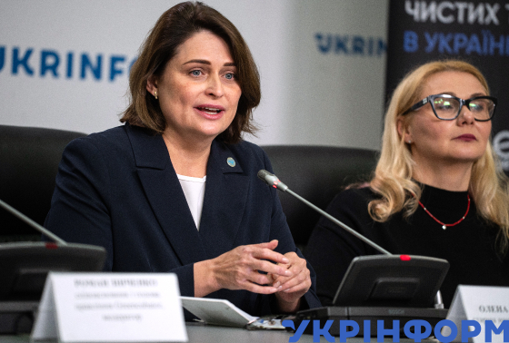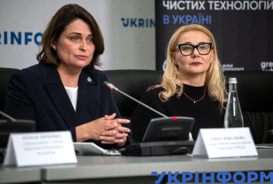 Старша національна експертка зі взаємодії ЮНІДО Олена Ковальова і виконавча директорка Національного фонду досліджень України Ольга Полоцька (зліва направо) під час пресконференції на тему: "Глобальна програма з розвитку кліматичних інновацій: UNIDO, GEF та Greencubator запускають в Україні другу фазу GCIP Ukraine", Київ, 2 квітня 2025 року.