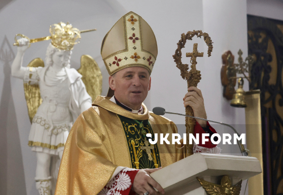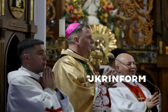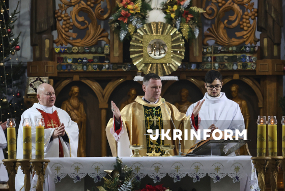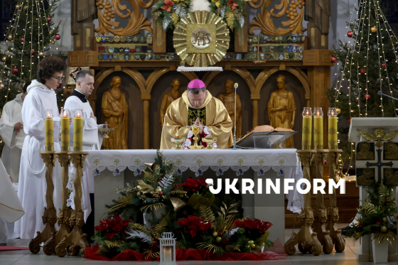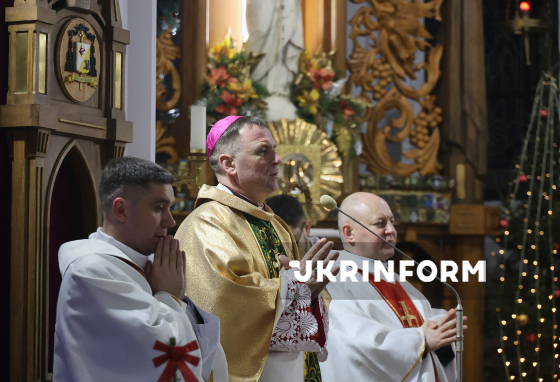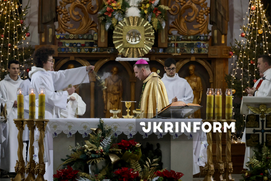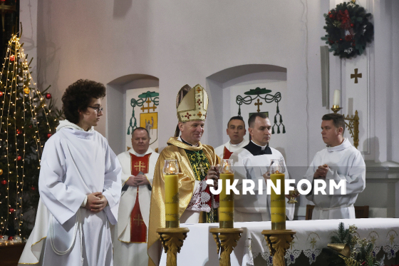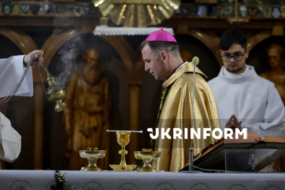 Єпископ-ординарій Харківсько-Запорізької дієцезії РКЦ отець Павло Гончарук очолює урочисту різдвяну святу месу у римо-католицькому катедральному соборі Успіння Пресвятої Діви Марії в Харкові, 24 грудня 2025 року.