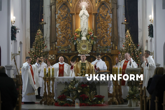Єпископ-ординарій Харківсько-Запорізької дієцезії РКЦ отець Павло Гончарук (у центрі) очолює урочисту різдвяну святу месу у римо-католицькому катедральному соборі Успіння Пресвятої Діви Марії в Харкові, 24 грудня 2025 року.