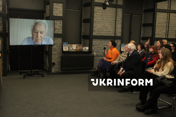 Директорка Публічної бібліотеки імені Лесі Українки для дорослих м. Києва, членкиня Видавничої ради при Департаменті суспільних комунікацій ВО КМР (КМДА) Ольга Романюк, автор повісті “Магда”, заслужений журналіст України Сергій Сай-Боднар, голова товариства “Німецький Дім-Київ — ЦНК “Відерштраль” Людмила Коваленко, директор видавництва “Бук-друк” Олексій Євенок (зліва направо) і двоюрідний внук Магди, якому у 1993 року вдалося після тривалих 25-річних пошуків знайти українську гілку родинного дерева Хоманнів-Кучинських, Петер Хоманн (онлайн з Німеччини) беруть участь у презентації художньо-документальної повісті “Магда” у пресцентрі Київінформ, Київ, 27 січня 2026 року.